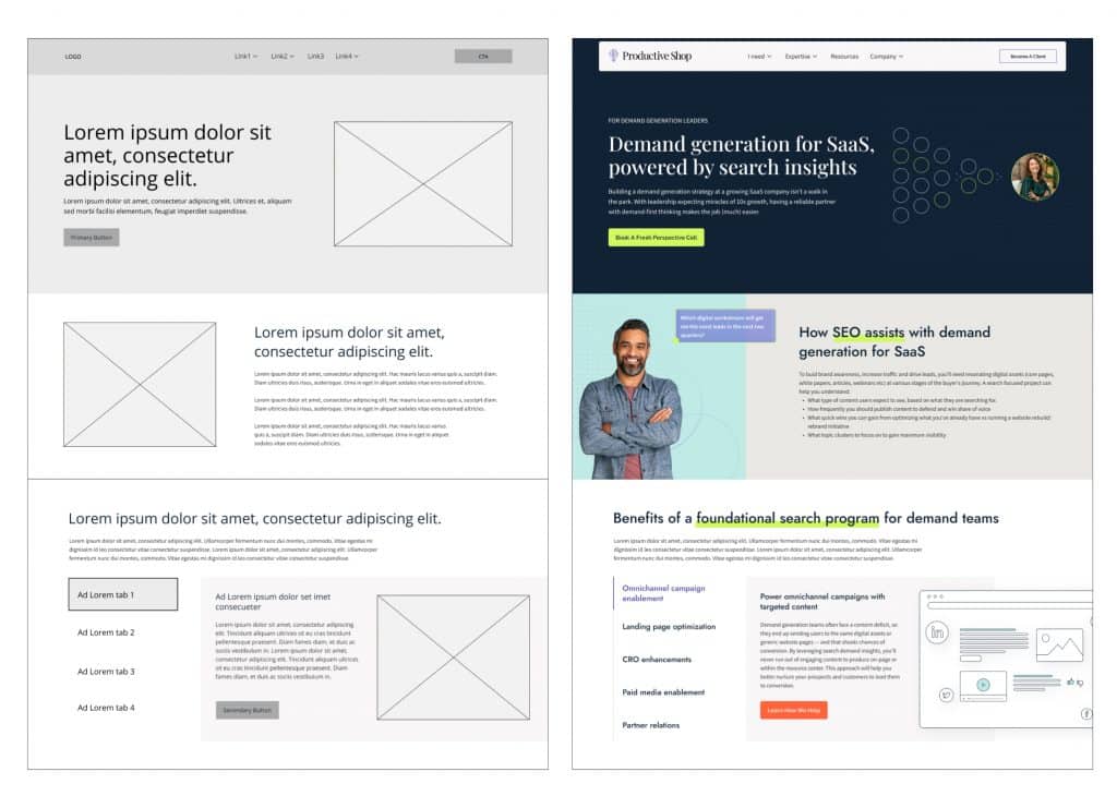 The first image shows our mid-fidelity wireframe and high-fidelity mockup for our Demand Generation Page. The second image shows the final design.
